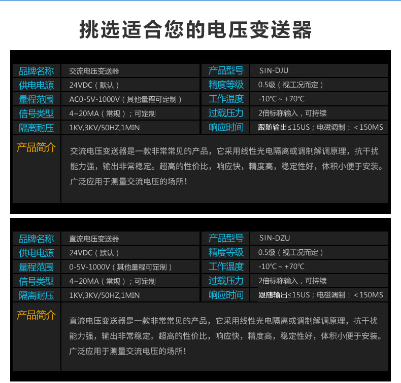 電壓變送器是一種將被測交流電壓、直流電壓、脈沖電壓轉換成按線性比例輸出直流電壓或直流電流并隔離輸出模擬信號或數字信號的裝置。