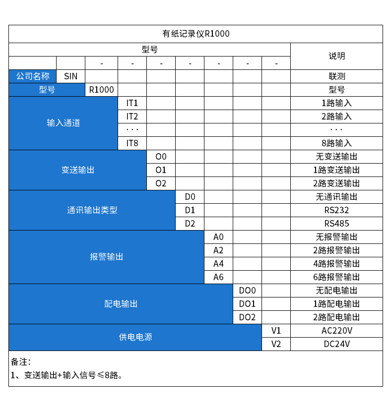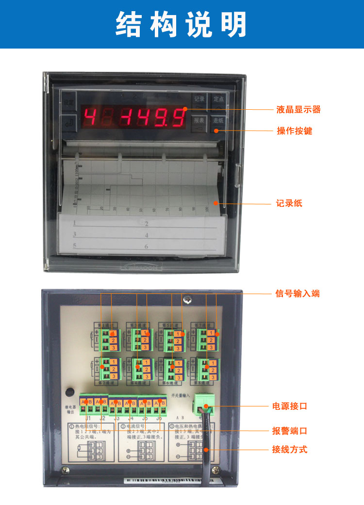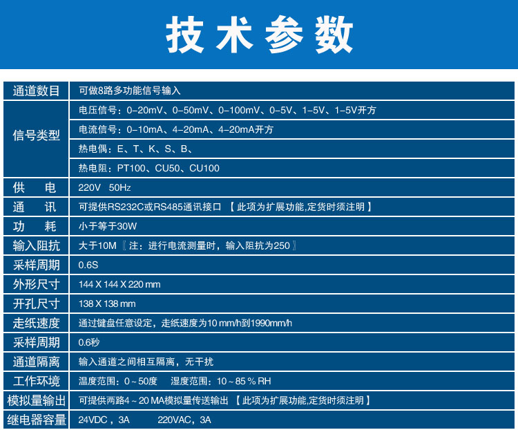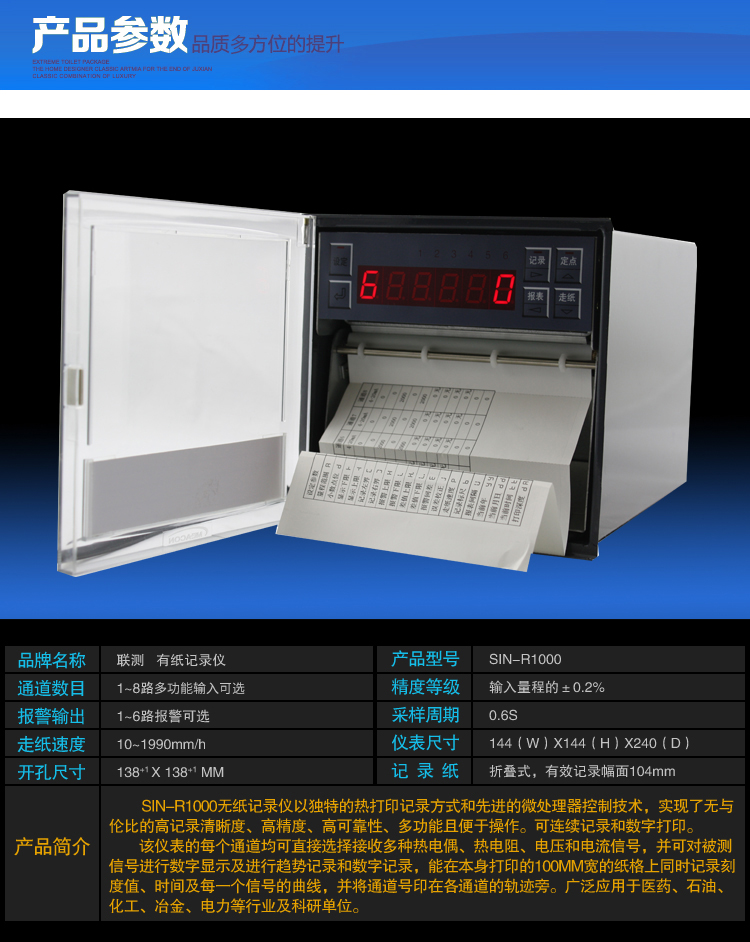 SIN-R1000有紙溫度記錄儀最多具有8路輸入通道,2路模擬量輸出,通道之間采用點(diǎn)點(diǎn)隔離;均可直接選擇接收多種熱電偶、熱電阻、壓力變送器、電壓、電流信號,并可對被測信號進(jìn)行數(shù)字顯示及進(jìn)行趨勢記錄和數(shù)字記錄,能在本身打印的120mm寬的紙格上同時(shí)記錄刻度值、時(shí)間及每一個(gè)信號的曲線,并將通道號印在各通道的軌跡旁。